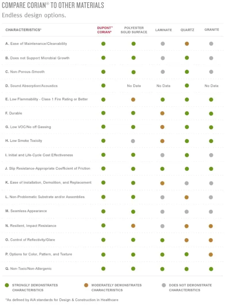 Corian is material which has specific abilities. Below we have placed a diagram which shows a comparison to the most popular worktop materials including Polyester Solid Solid Surface, Laminate, Quartz and Granite. All information is declared by Dupont the manufacturer of the material and possible to check on their website. Please see the source.