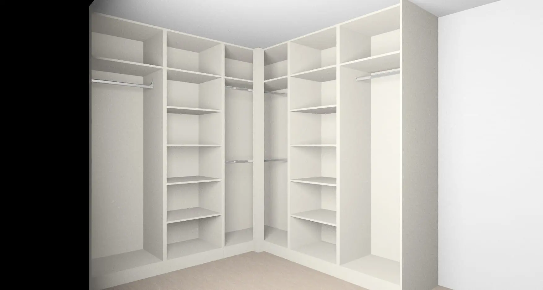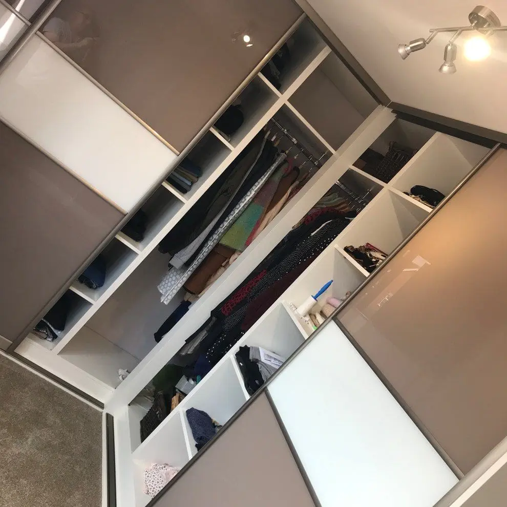 Corner L shape sliding door wardrobe. The realisation of this spacious and functional made to measure wardrobe started from the interview regards the requirement for the size and practical functions of the wardrobe.