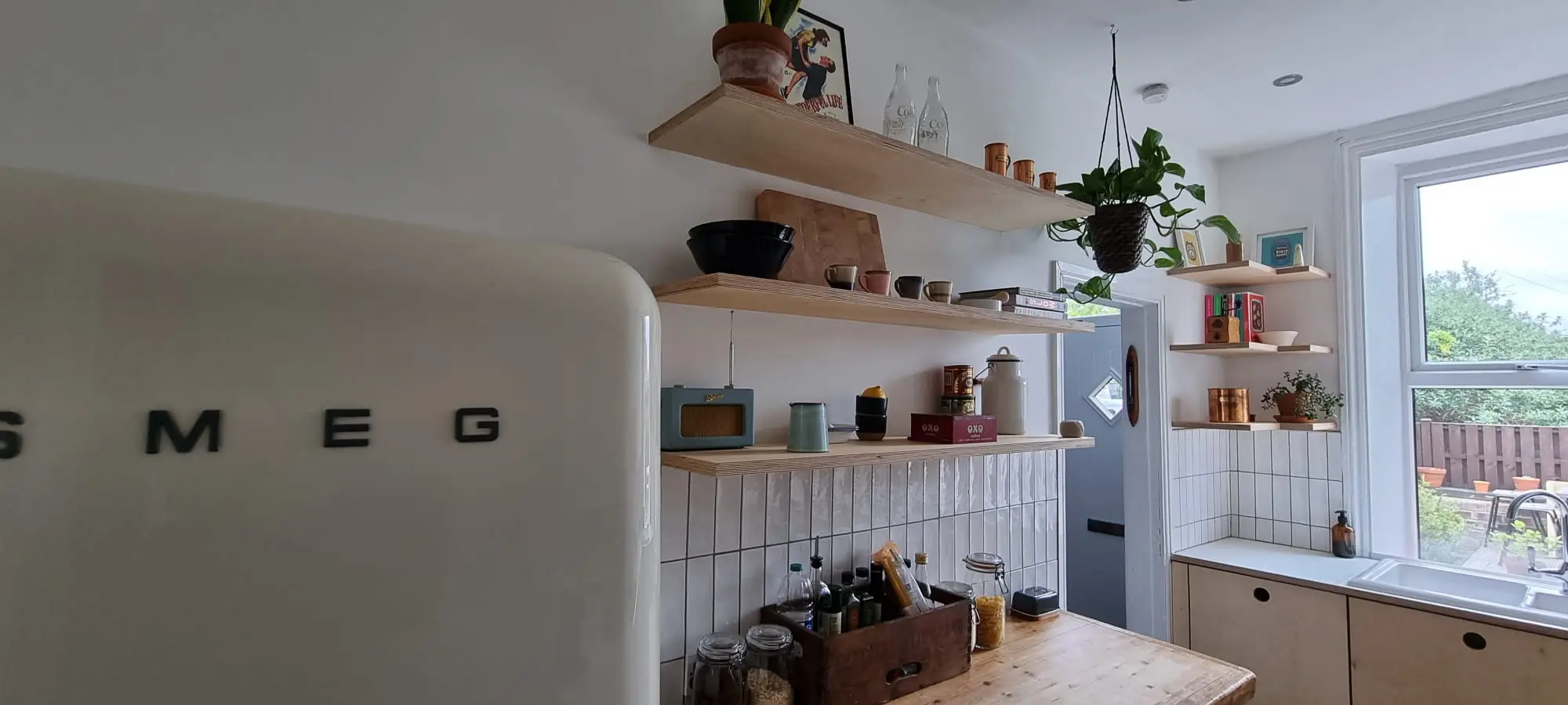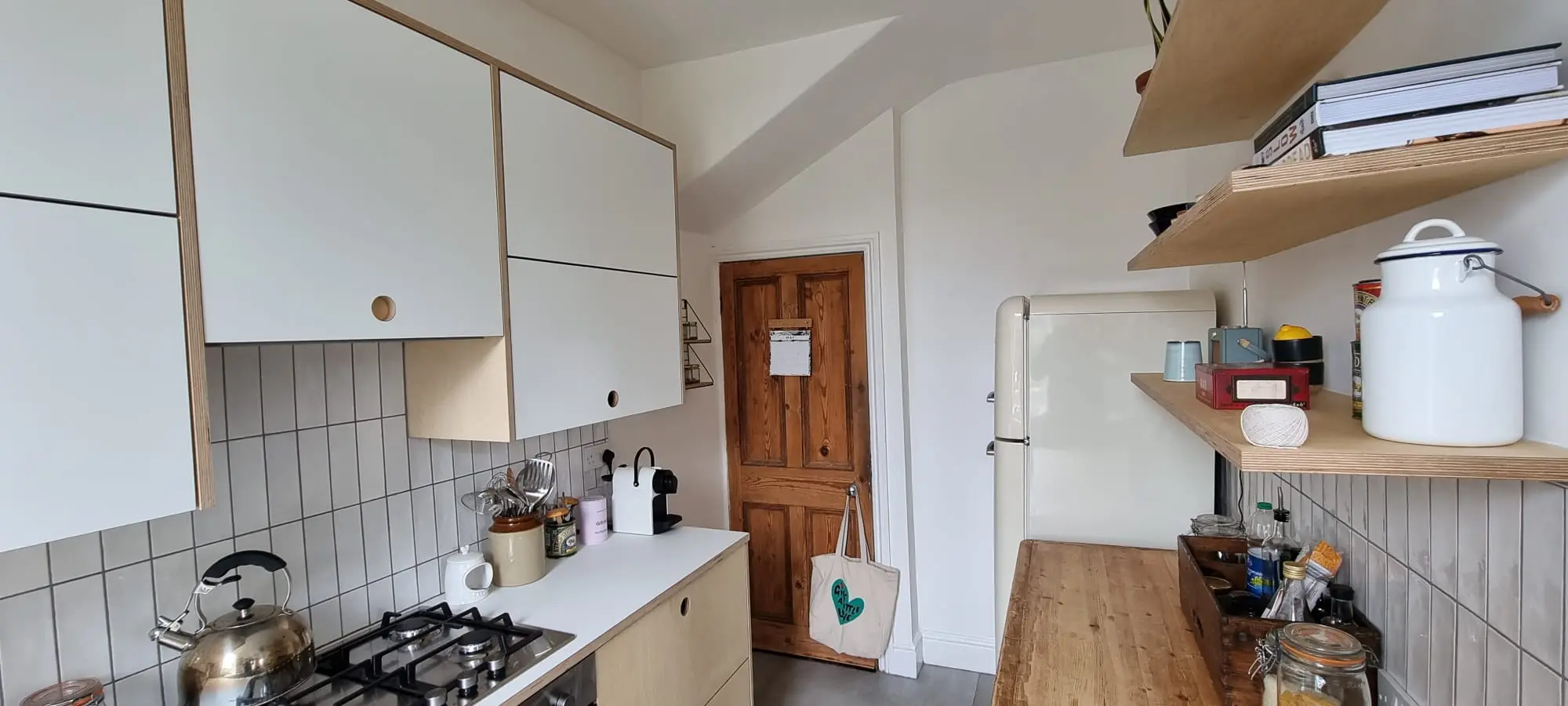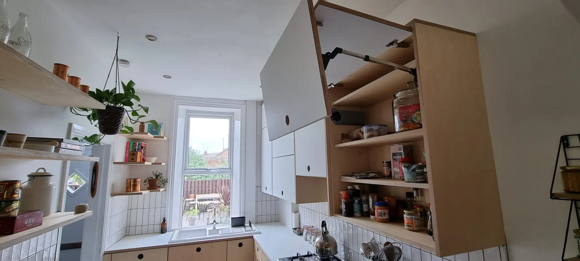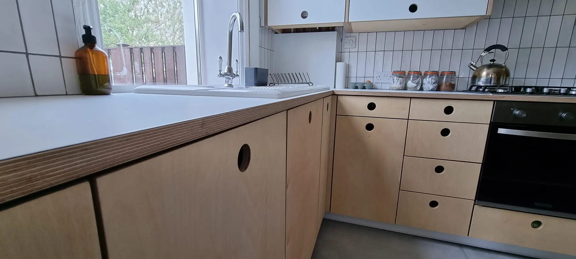We recently completed this Flat Door white matte plywood core L shaped kitchen Kitchen for a local client based in Leeds, West Yorkshire. Their main requirement for the project was to optimise available space in a combination of modern and natural styles. After consultations and analysis of the available space, customers needs and budget prepared for the project we started the designing process.
