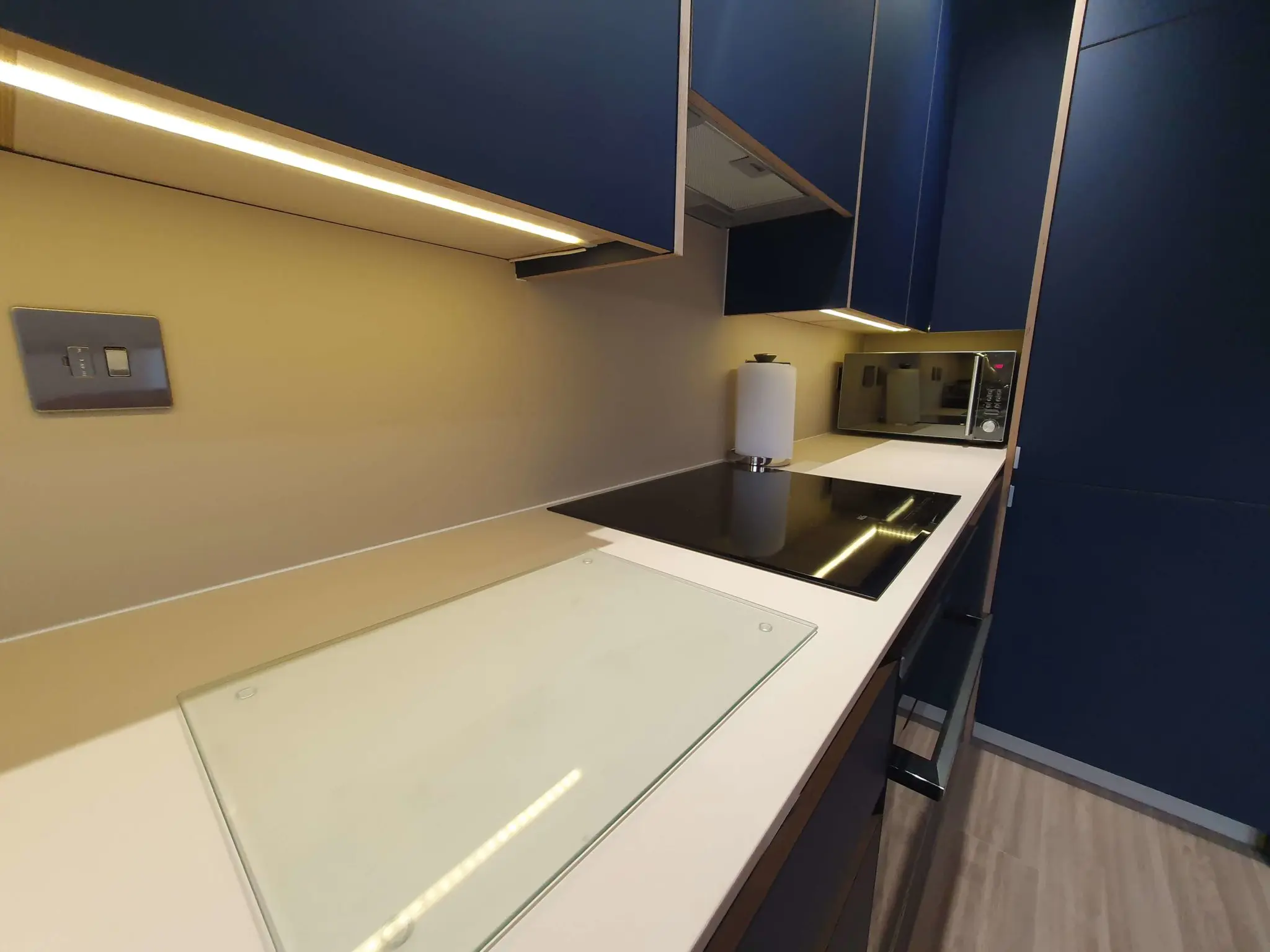 For the doors and end panels, we used the BLU FES colour 0.9mm laminates attached to plywood panels. For the worktop and splashback solid core 12mm Fenix NTM BEIGE LUXOR. Soft close drawers and hinges made by Blumm with a lifetime warranty.