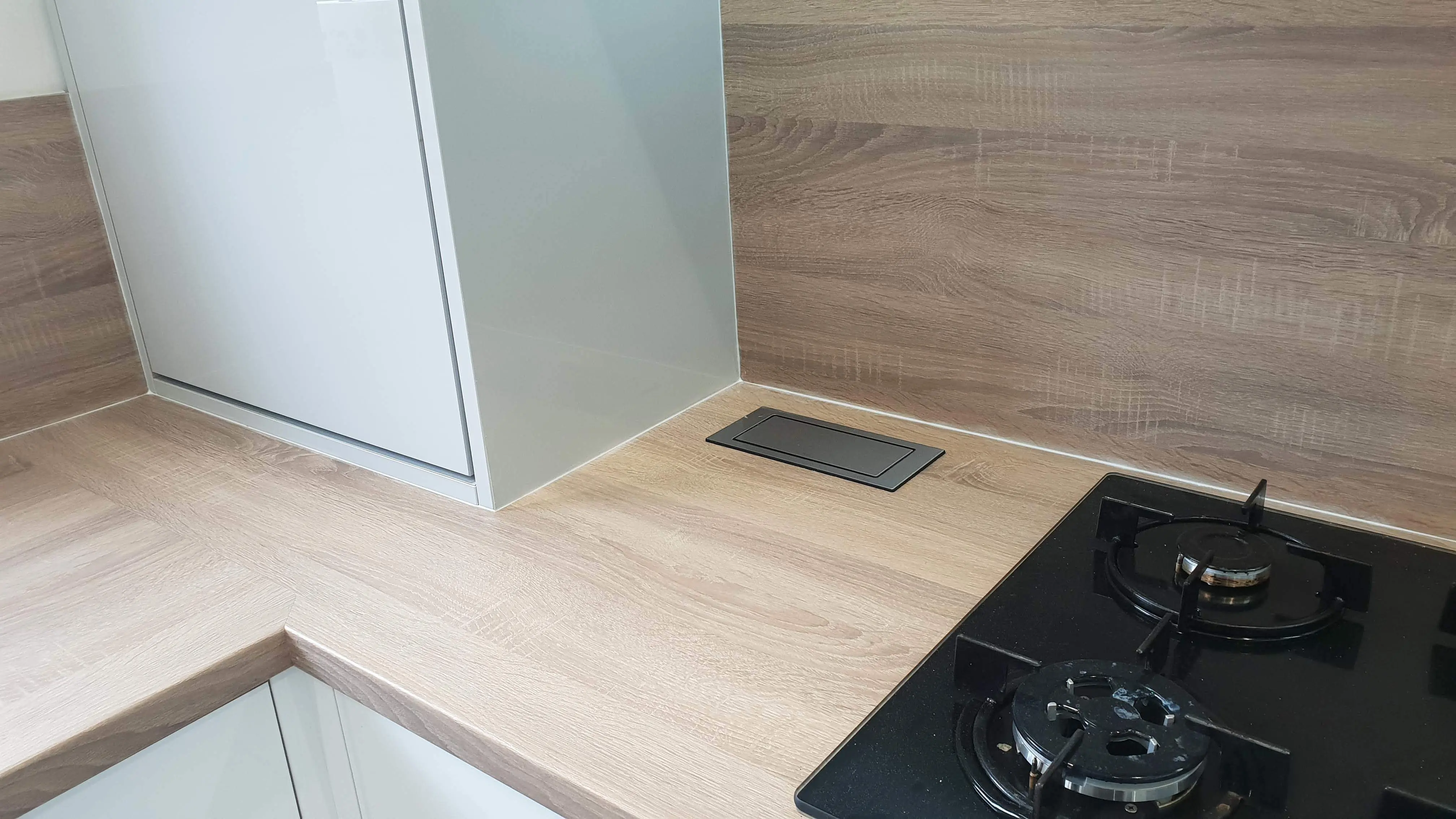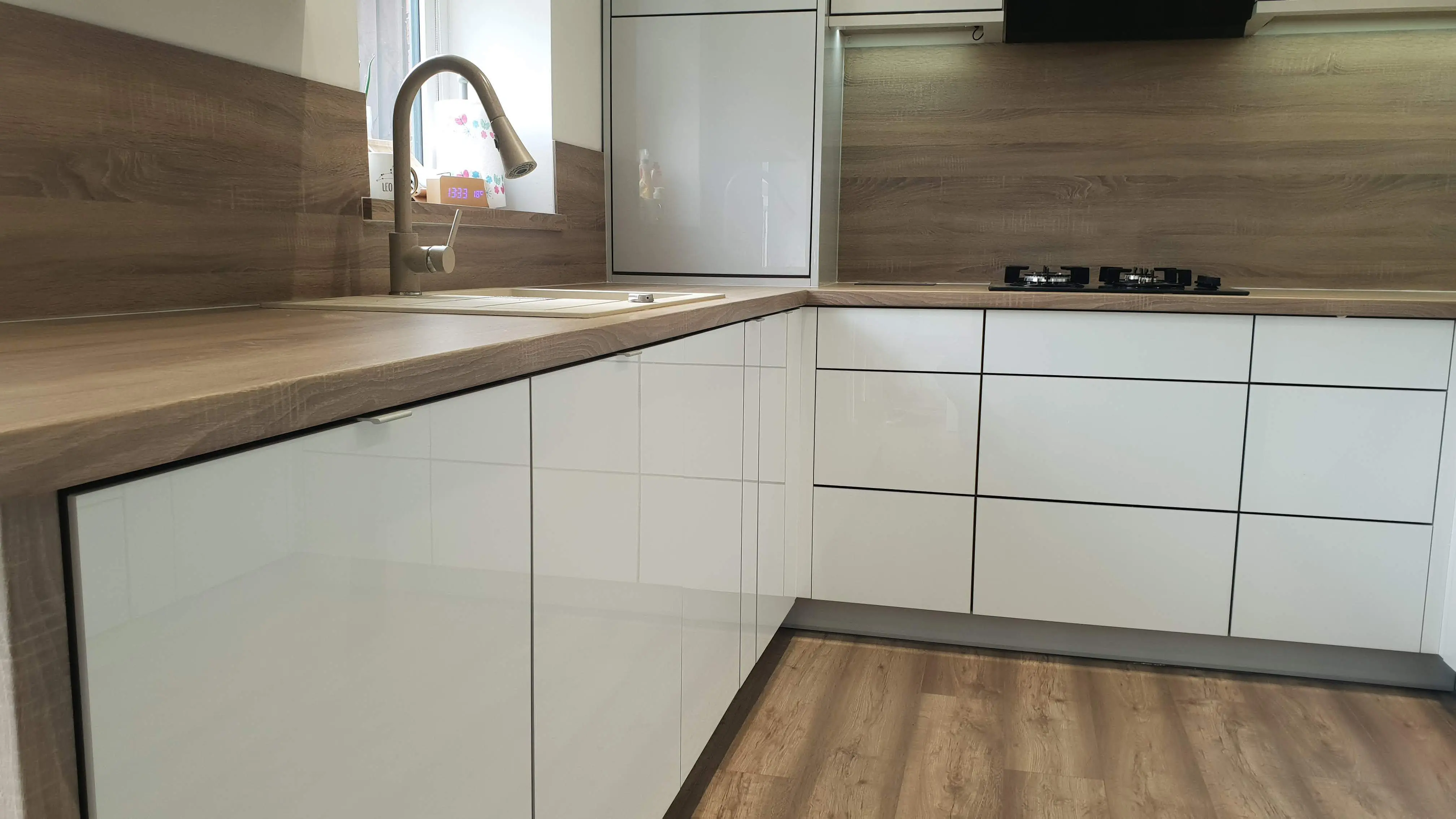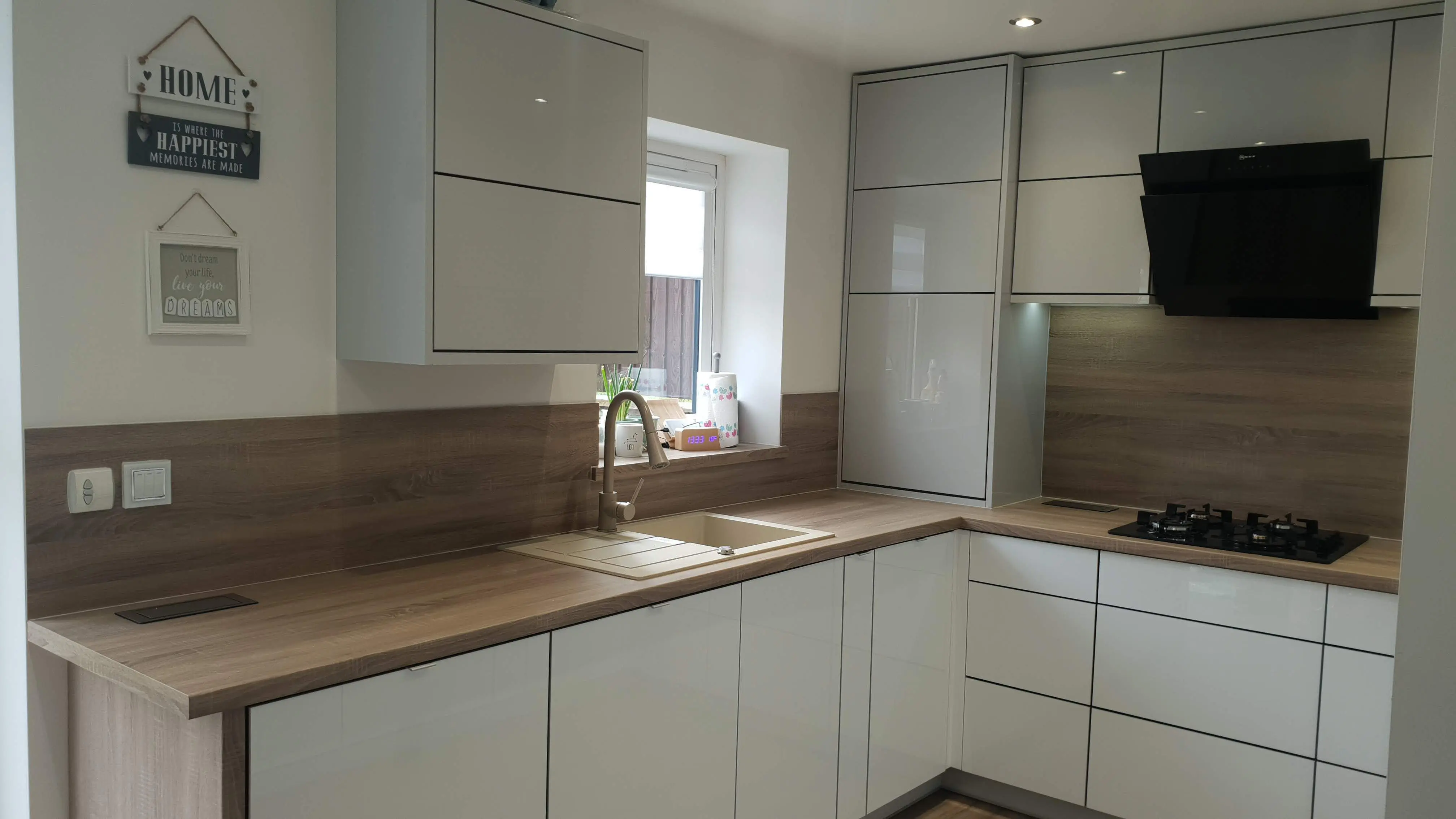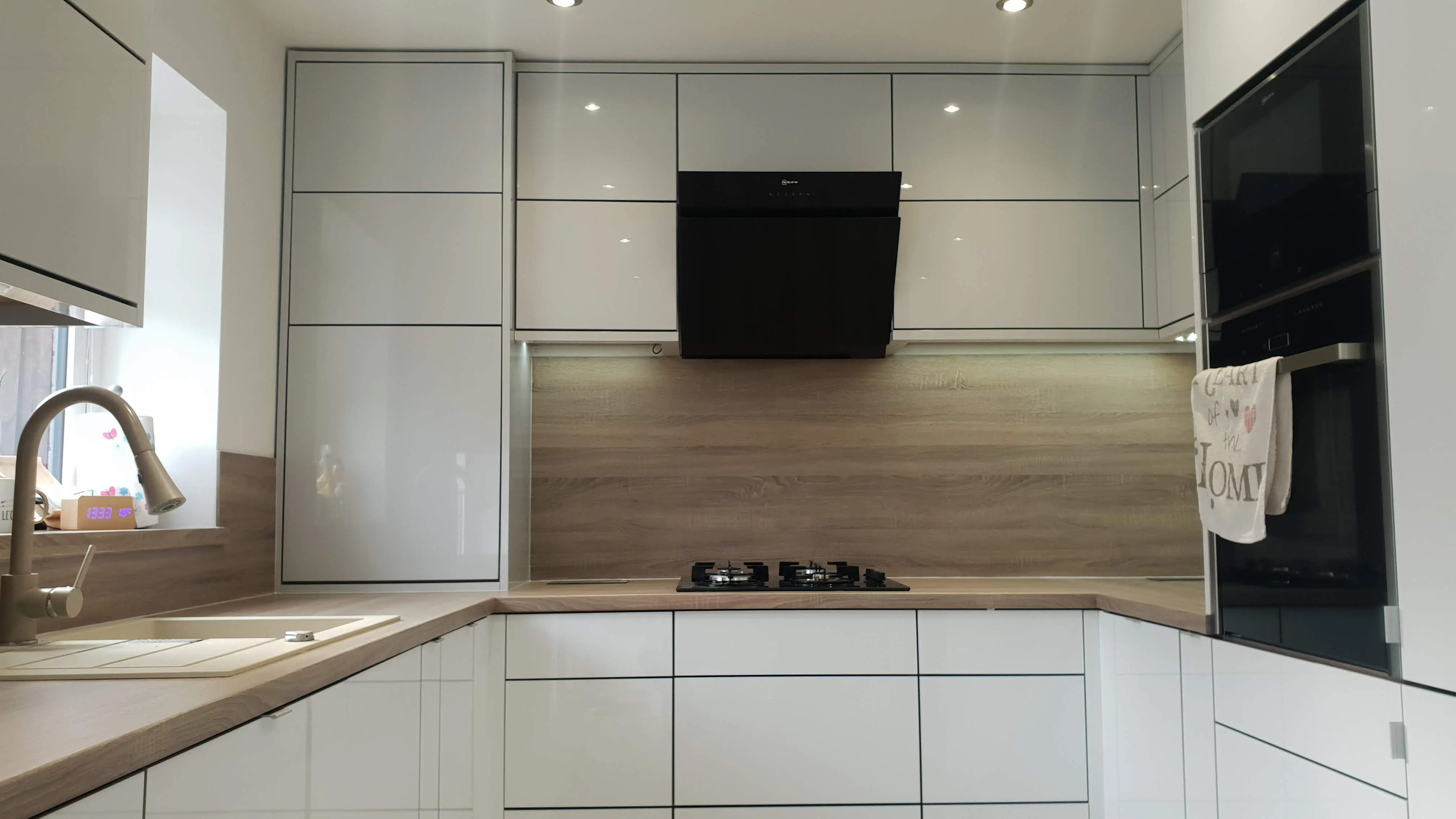 Doors of the kitchen are made of high gloss acrylic-coated board in two shades of white and grey. For the worktop, we have used high-quality Egger Bardolino Oak laminate on the 38mm chipboard core, and the same decor has been used for the splashback.