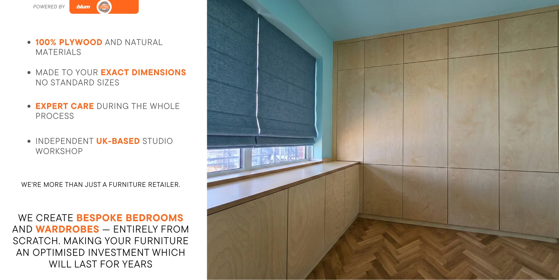 We design and manufacture fully bespoke fitted wardrobes, bespoke plywood wardrobes and bedroom furniture in our Yorkshire workshop. Every project is made to measure around your exact room dimensions rather than built from fixed modules or standard carcass systems.