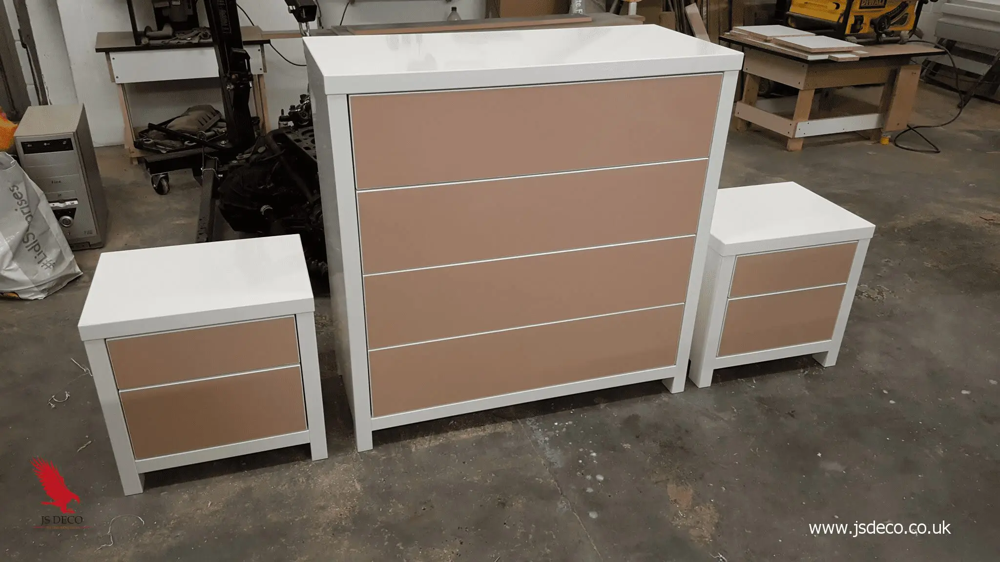 Completing this project of bedroom furniture set we have also manufactured two bedside units and push to open drawer chest. All furniture was true handleless and matching materials used for the wardrobe, with the use of high-quality Blum components.