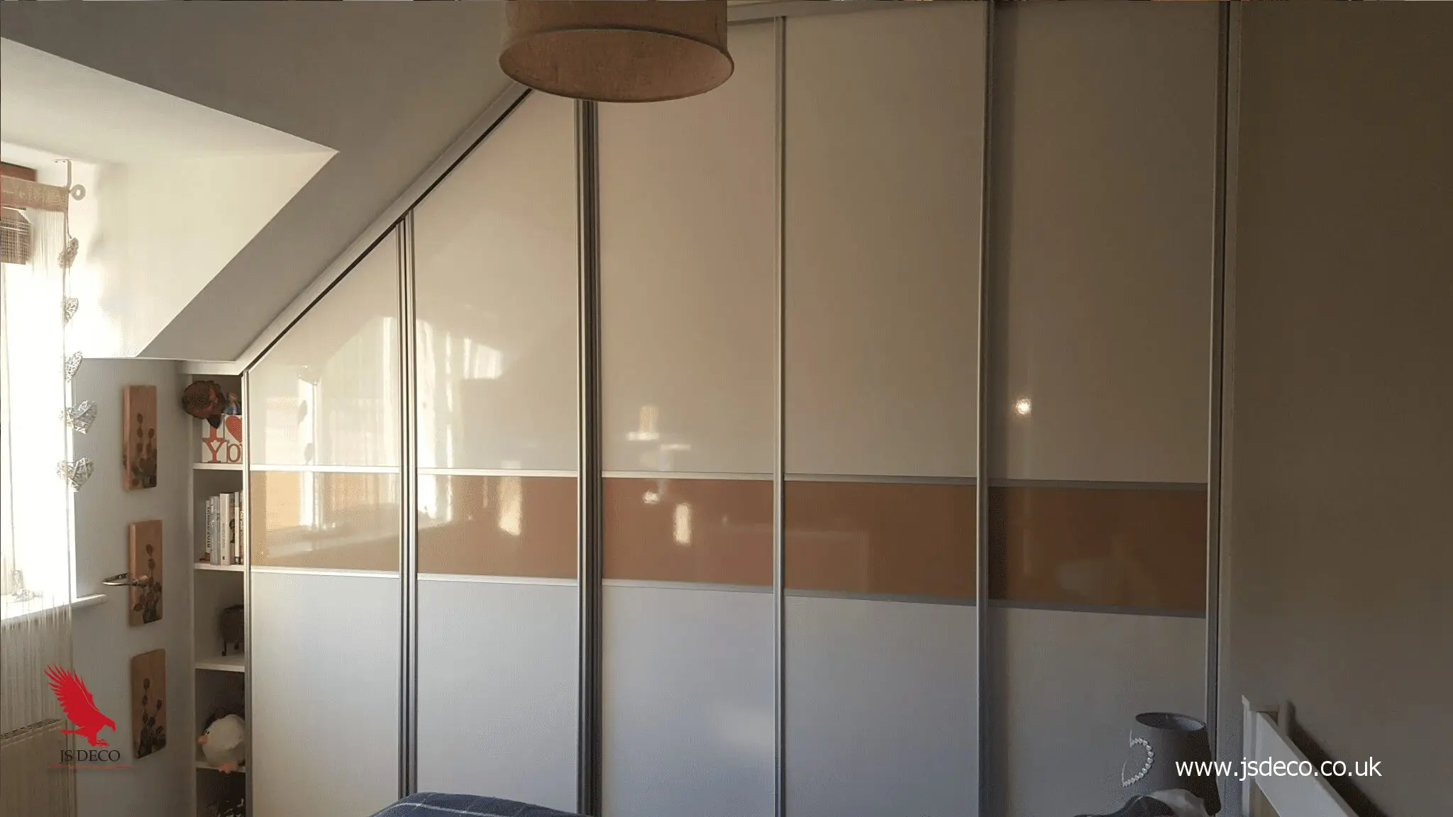 One of our sliding door wardrobes realization made to measure for the customer requirements based in Wakefield West Yorkshire. This time we have combined high gloss acrylic board placed in the aluminium frame. The Doors are made of materials in the worm pastel bright tones to make an expression of bigger space.