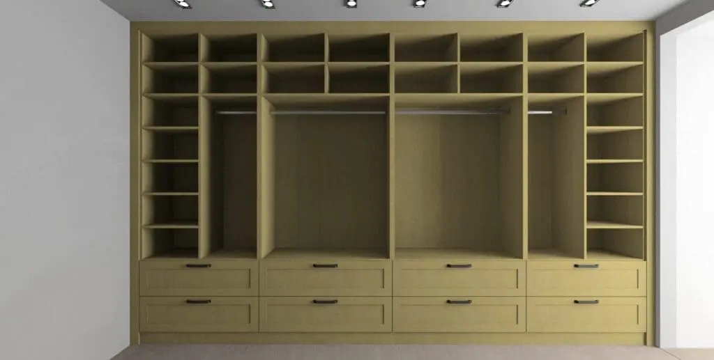 The bedroom where the project was located had a wall-size 4m long and 2.4m high, with the fitted wooden wardrobes designed to run along the walls of the bedroom. That was the space for which we designed the layout and storage functions of the wardrobe.