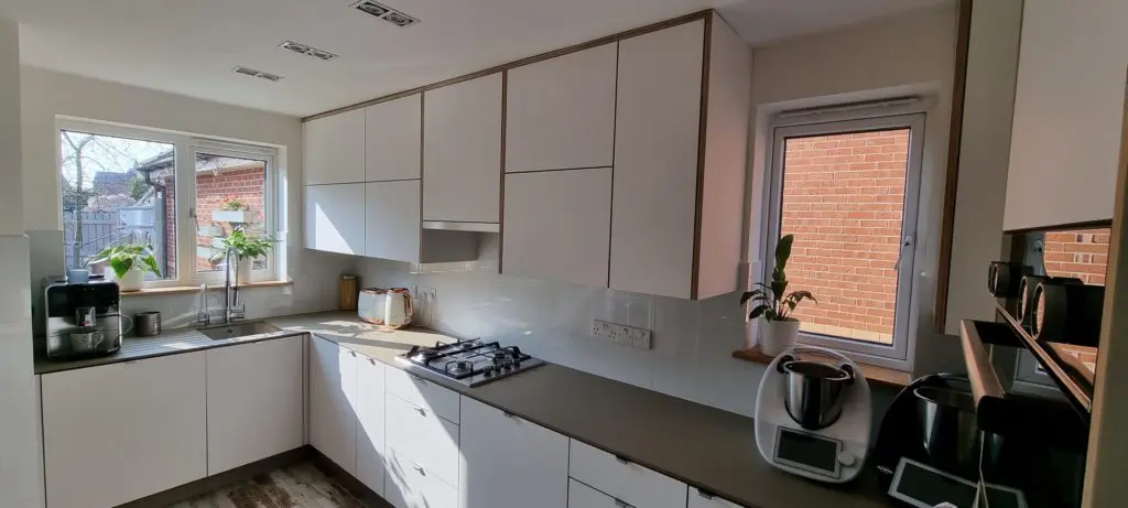 Worktop which we used for this project was a 12mm solid matching solid core Bianco Male Fenix NTM laminate with integrated drain groves and an under-mounted sink which significantly improve functionality and kept to worktop tidiness.