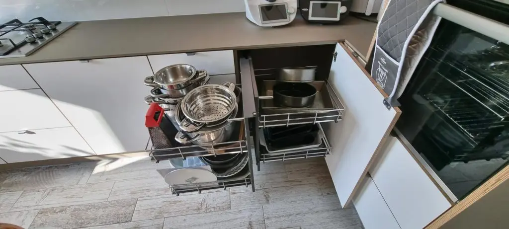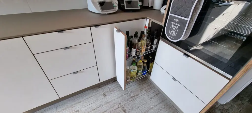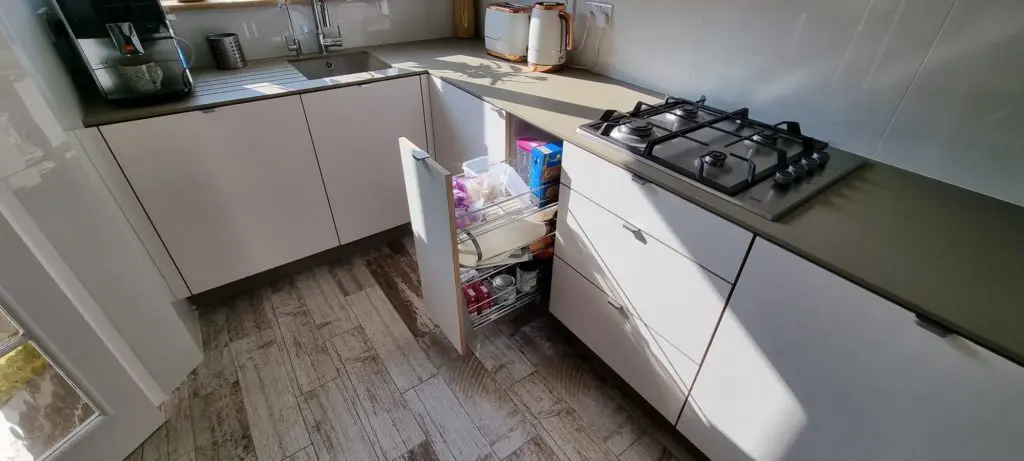 During the consultation, we have located critical points in the kitchen from the customer’s point of view in the matter of comfort of use and ergonomy. Starting from the corners there are extra wide magick corner solutions on each side of the kitchen which optimise storage space and access to the content. There are also two pull out baskets one 200mm wide and the other 300mm wide for smaller items. There is also a 600mm wide pull out bin with an additional drawer above it. To complete the furniture functionality we have also applied a number of soft close drawers in many different locations including under the hob and double oven.