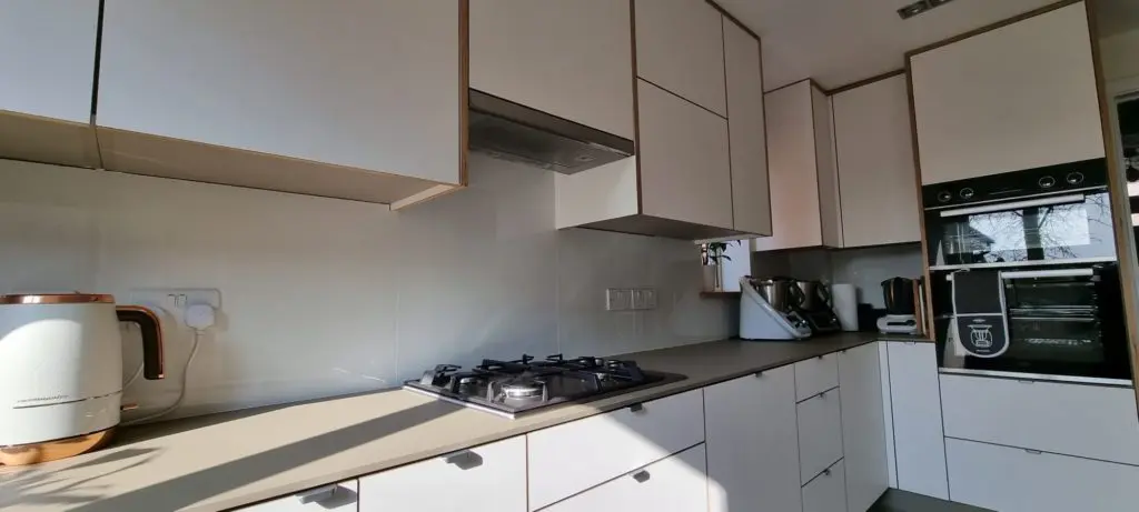 The modern style plywood kitchen which we are presenting today was designed manufactured and installed for one of our customers based in the Leeds district. After detailed consultation regarding the available budget and priorities in the matter of style and functions, we ended up choosing one of our premium range kitchens which is the FENIX NTM line. This product is made on the base of 18mm birch plywood impregnated with Osmo oil wax and finished with laminates in a wide pallet of colours.